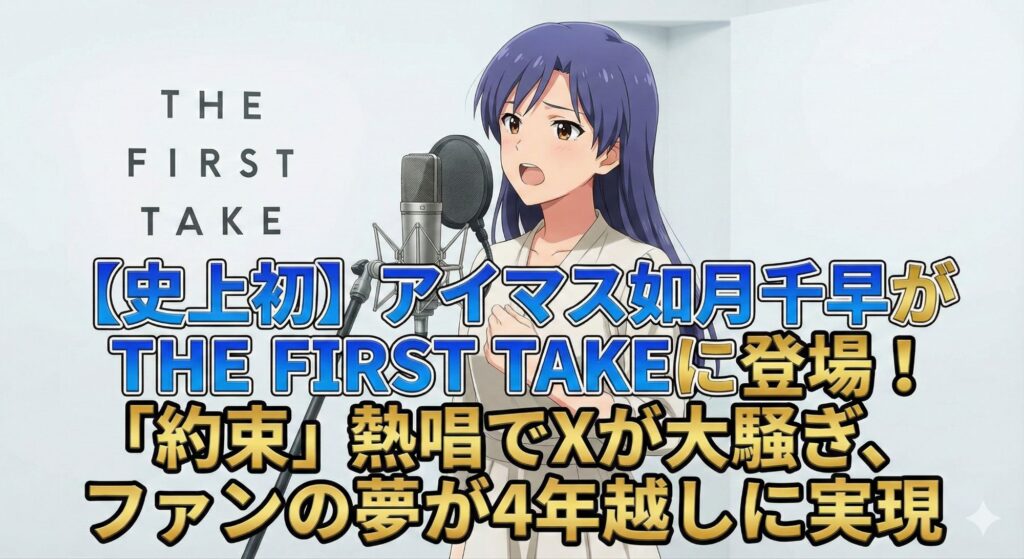 THE FIRST TAKE第615回に如月千早が登場し、代表曲「約束」をスペシャルピアノアレンジで熱唱したことは、アイマスファンにとっても、音楽シーン全体にとっても、大きな出来事でした。ゲーム・アニメのキャラクターがTHE FIRST TAKEに出演する史上初の快挙であり、4年前のファン予想が的中するというドラマチックな展開も相まって、Xでは感動と歓喜の声が溢れています。