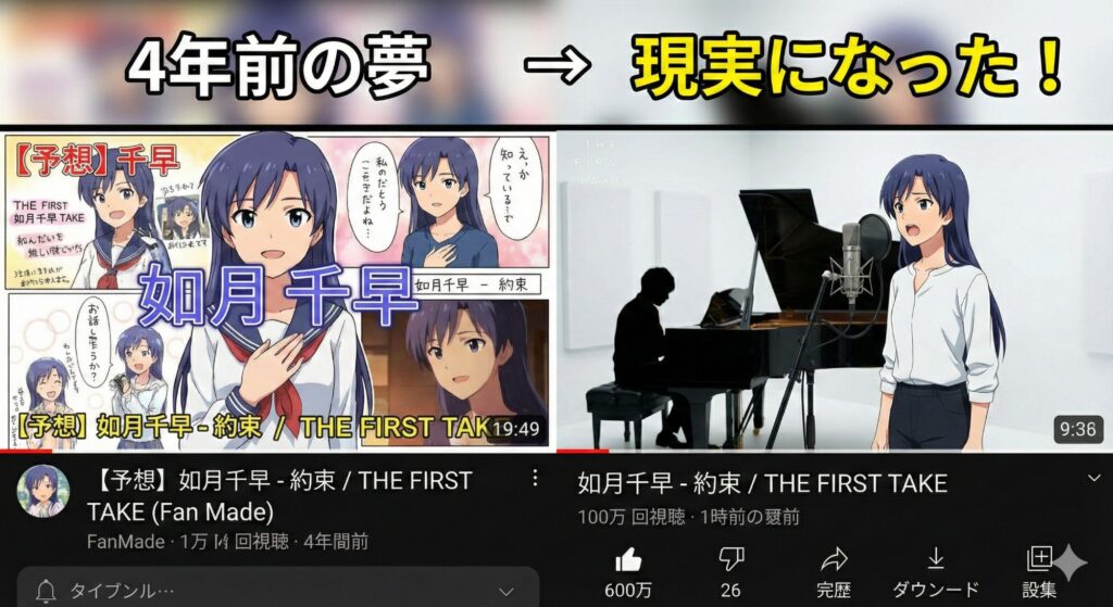今回の出演で注目されているのが、2021年2月に投稿されたファンの「予想動画」です。あるファンが「如月千早-約束/THE FIRST TAKE」というタイトルでファンメイドの映像を投稿しており、「いつかこれが実現したら…」という夢を語っていました。