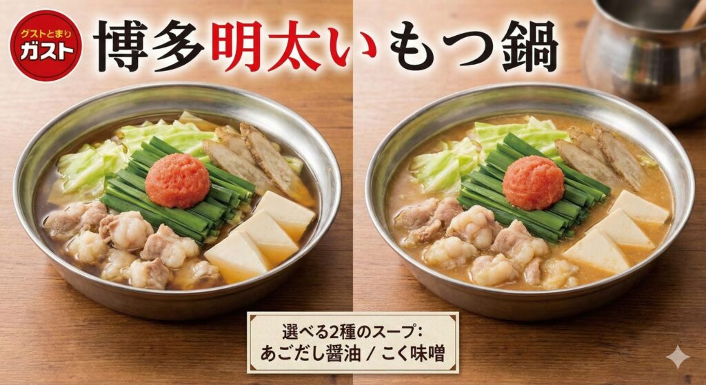 本場の「博多もつ鍋やまや」では4,000円〜4,999円のコース料理が中心ですが、ガストでは1,290円から本格的なもつ鍋が楽しめます。約3分の1の価格で名店の味を体験できる点が、多くの支持を集めています。