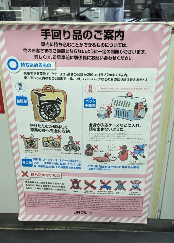 電車での移動はとても便利ですが、荷物の取り扱いには注意が必要です。特にJRグループの列車を利用する際には、持ち込める荷物の種類やサイズに制限があります。今回は、JRグループのポスターを元に、具体的な事例を交えながら、持ち込み可能な荷物と持ち込み禁止の荷物について詳しく解説します。