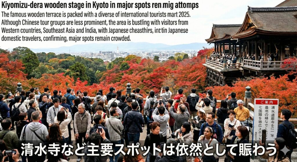 X上の実況から総合すると、中国便減便による中国人観光客の減少で、京都の混雑状況は「場所によって」大きく異なっています。主要観光地は依然混雑していますが、周辺エリアや特定のスポットでは相当に空いている状況が報告されています。インバウンド観光に大きく依存していた京都の観光地も、この変化への適応を迫られることになりそうです。
