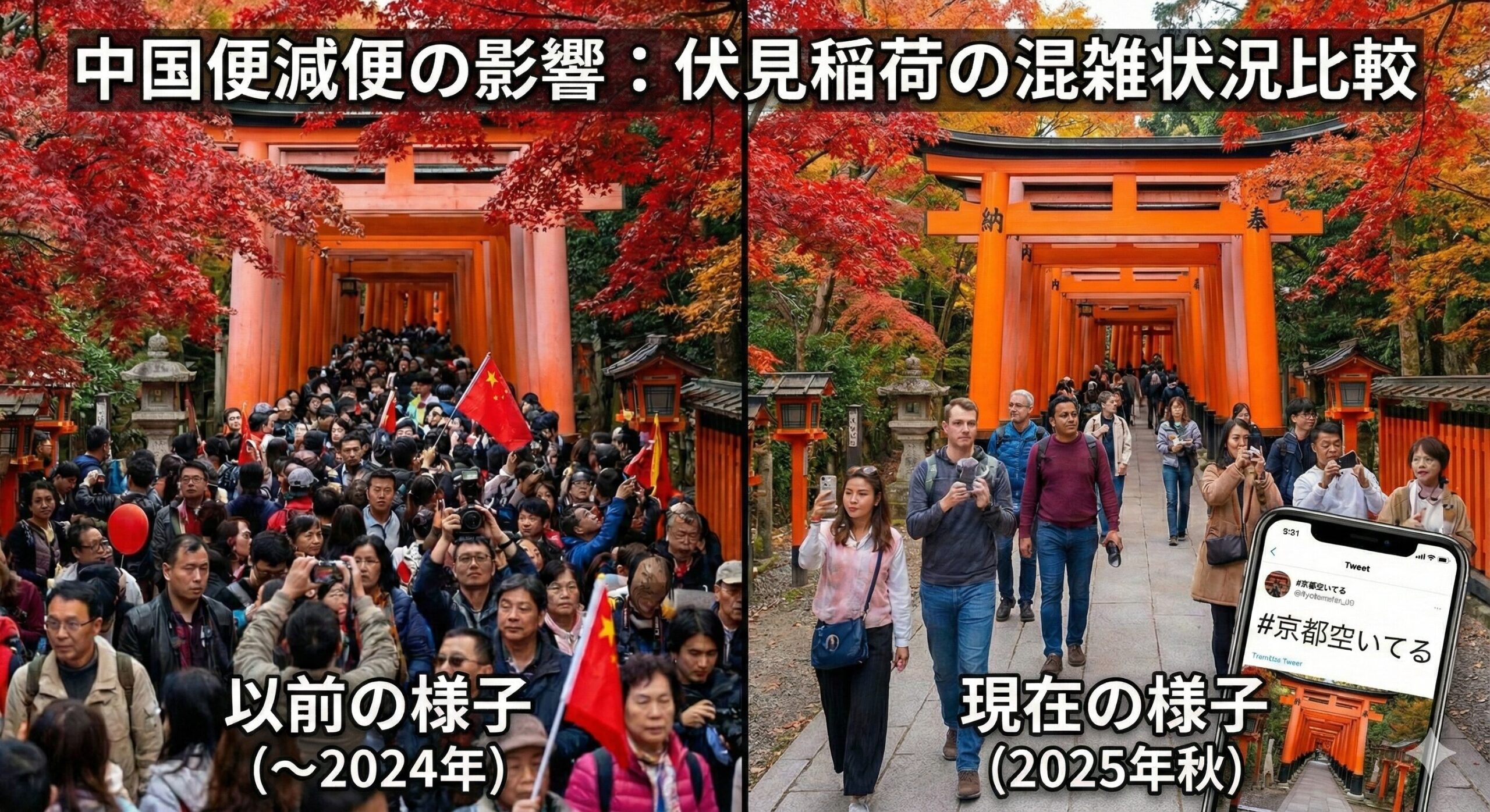 X上の実況から総合すると、中国便減便による中国人観光客の減少で、京都の混雑状況は「場所によって」大きく異なっています。主要観光地は依然混雑していますが、周辺エリアや特定のスポットでは相当に空いている状況が報告されています。インバウンド観光に大きく依存していた京都の観光地も、この変化への適応を迫られることになりそうです。