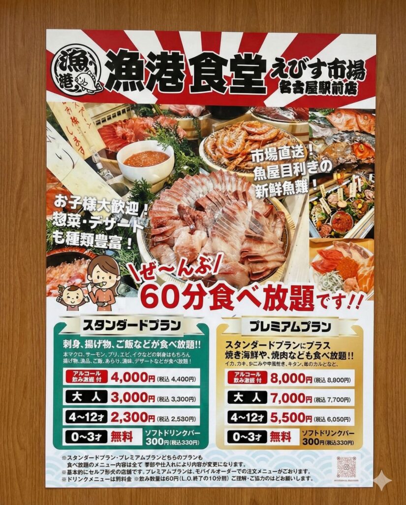 どちらの店舗も基本は60分制のセルフビュッフェ方式で、刺身を中心にさまざまなメニューが食べ放題になります。名古屋駅前店のスタンダードプランは大人3,300円(税込)で、刺身・揚げ物・ご飯・カレー・デザートなどが食べ放題。原店は平日2,980円/土日祝3,480円(税込)で、子ども料金や3歳以下無料の設定もあり、ファミリー利用を意識した価格になっています。