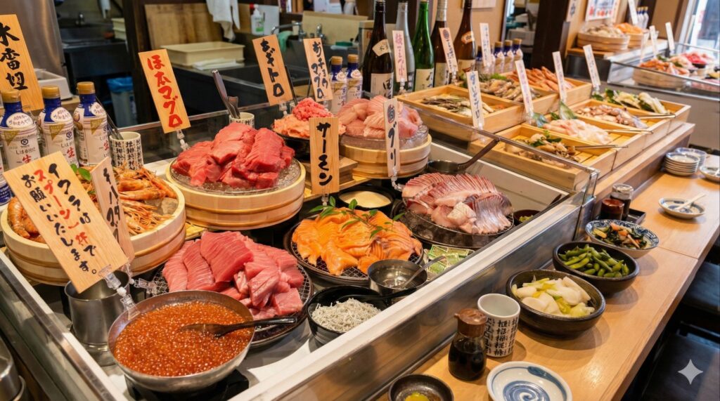 一部の回転寿司チェーンでは、期間限定で寿司食べ放題プランを実施することがあり、「マグロ」「サーモン」など定番ネタを中心に好きなだけ楽しめます。 - 和食バイキング・ホテルビュッフェ