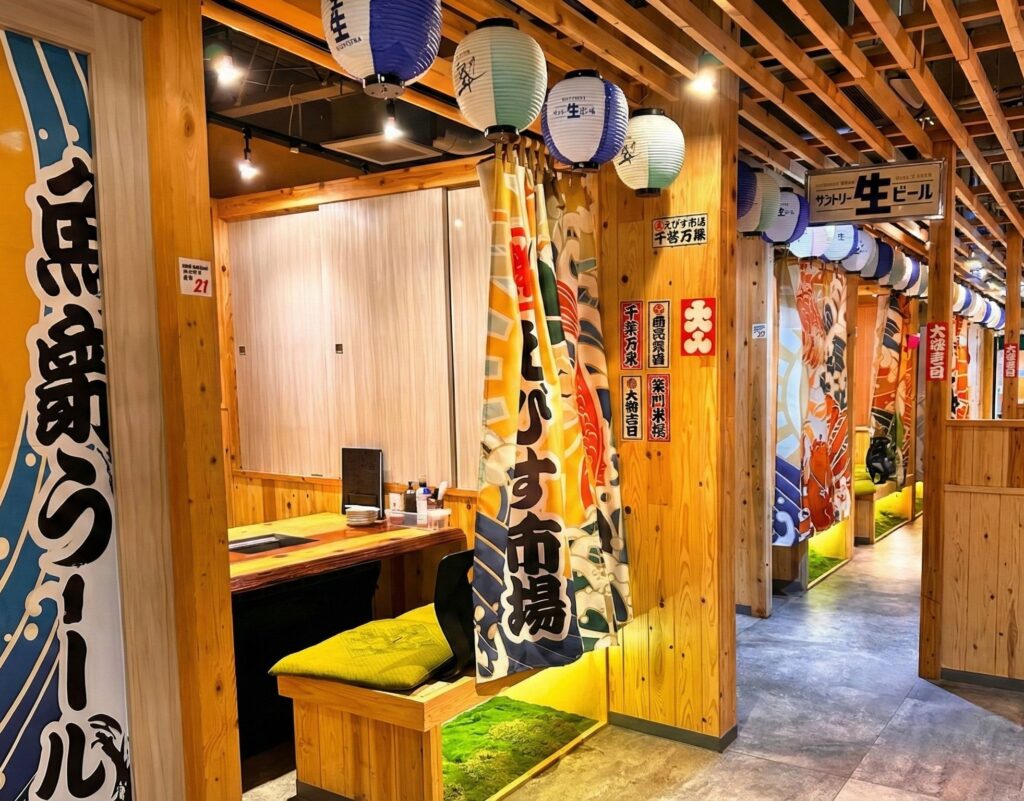 天白区の「漁港食堂 えびす市場 原店」は、全席個室メインで、キッズルームや足湯付き個室なども用意されたファミリー向け店舗になっています。掘りごたつや座敷席もあり、子ども連れでも周りを気にせずゆっくり刺身食べ放題を楽しめるのが魅力です。