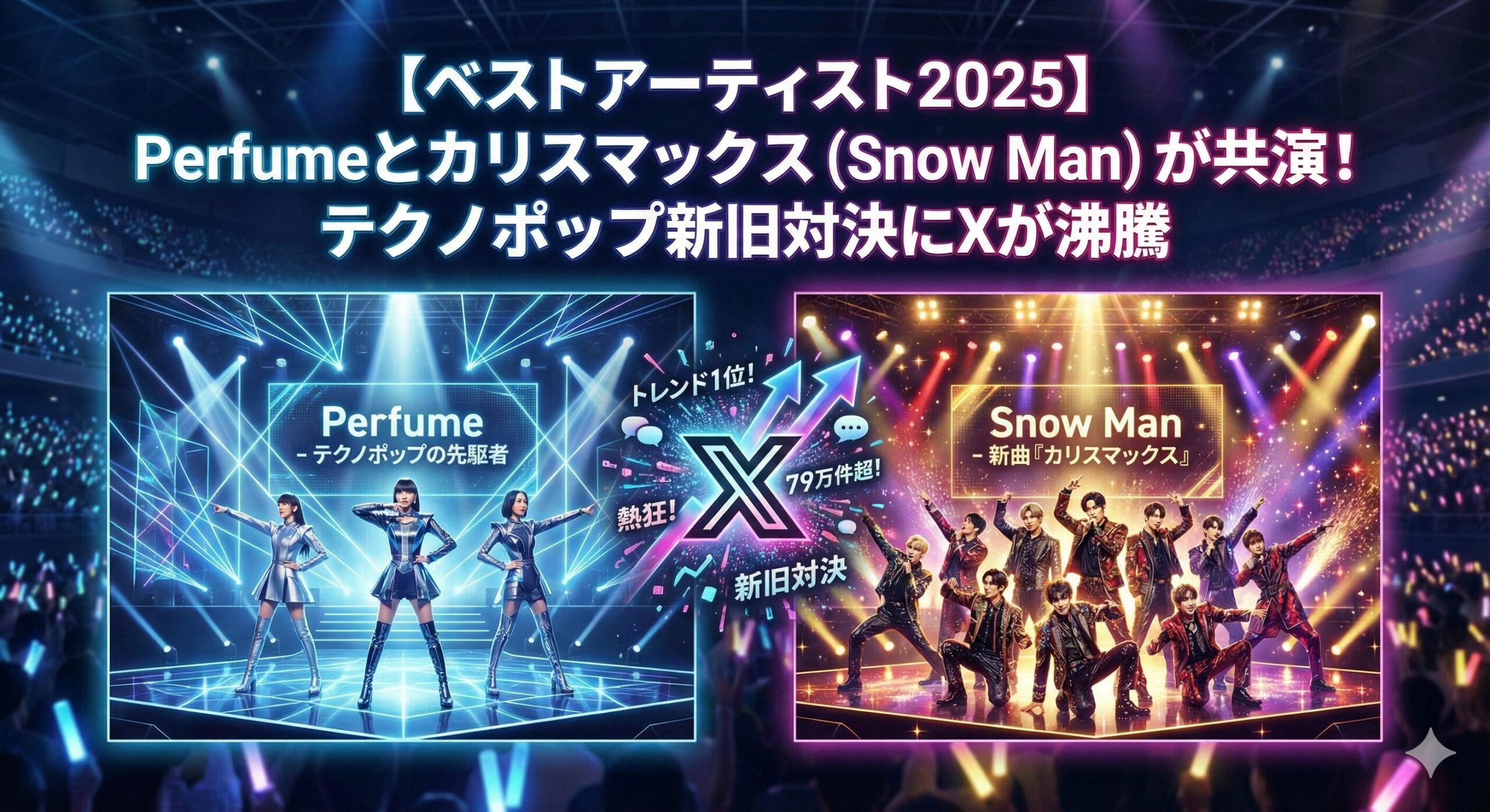 2025年11月29日放送の日本テレビ系「ベストアーティスト2025」で、テクノポップ界の先駆者・Perfumeと、ジャニーズの人気グループSnow Manが新曲「カリスマックス」を披露したことが大きな話題になっています。番組トレンドは79万件を超え、Xでは「Perfume」46,260件、「カリスマックス」39,071件、「パフォーマンス」150,738件と、音楽ファンの熱い議論が繰り広げられました。