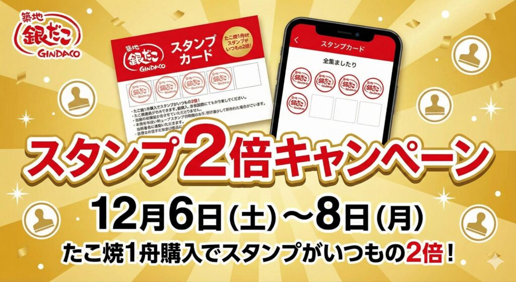 390円セールに続き、12月6日(土)〜8日(月)の3日間は、「銀だこスタンプカード」のスタンプが2倍になるキャンペーンも実施されます: