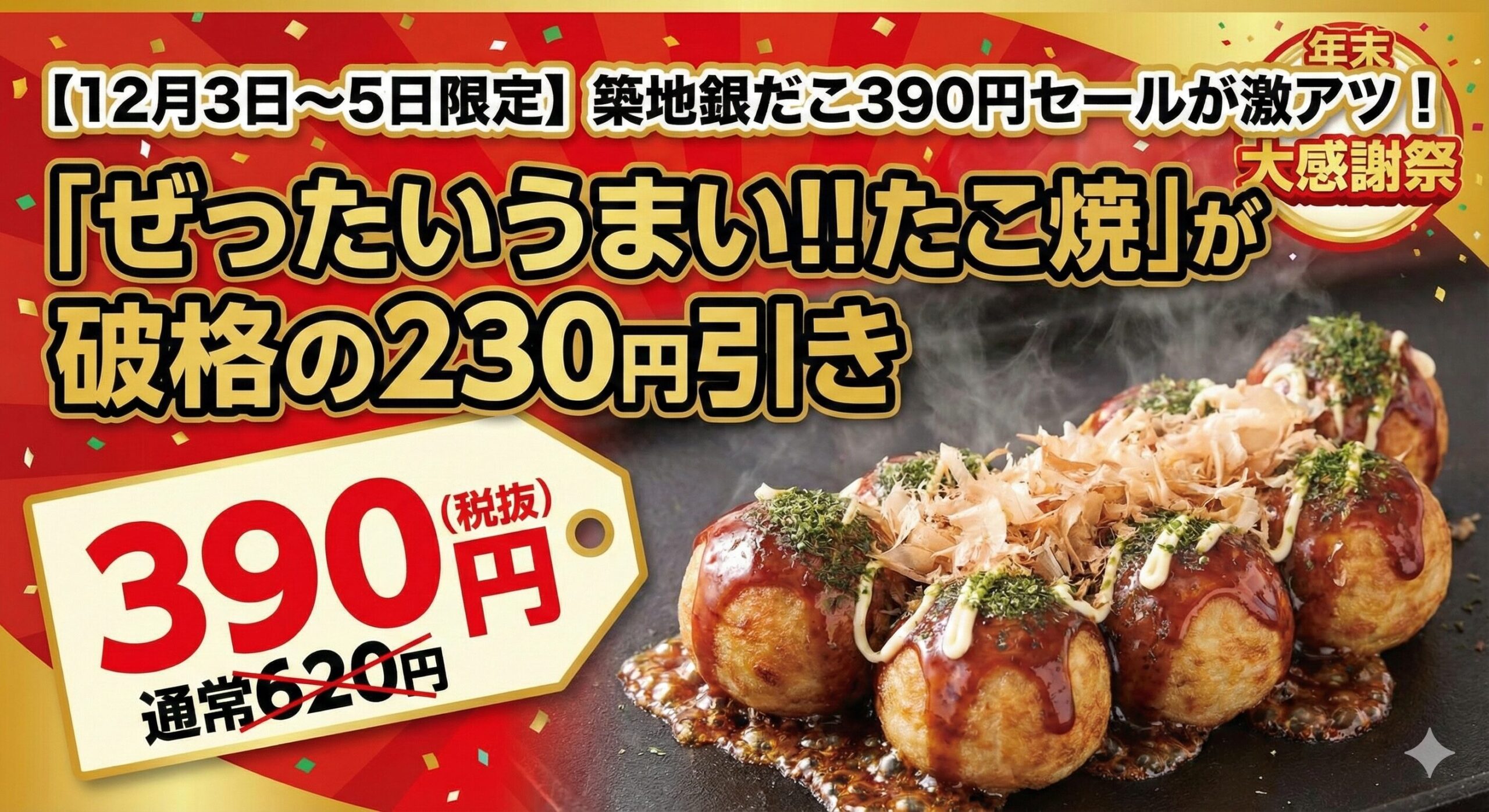 たこ焼きチェーン大手「築地銀だこ」が、2025年12月3日(水)から5日(金)までの3日間限定で、年末大感謝祭を開催します。人気NO.1メニュー「ぜったいうまい!! たこ焼(ソース・8個入り)」が通常620円(税抜)から390円(税抜)へと大幅値下げされ、実に230円もお得に購入できます。本記事では、キャンペーンの詳細からX(旧Twitter)上での反応、過去の類似セール事例まで徹底解説します。