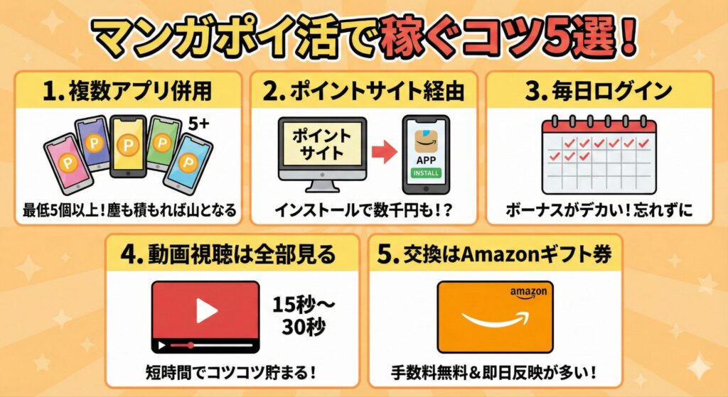 マンガポイ活とは、特定のアプリやサイトで無料漫画を読むだけでポイントがもらえる仕組みのこと。