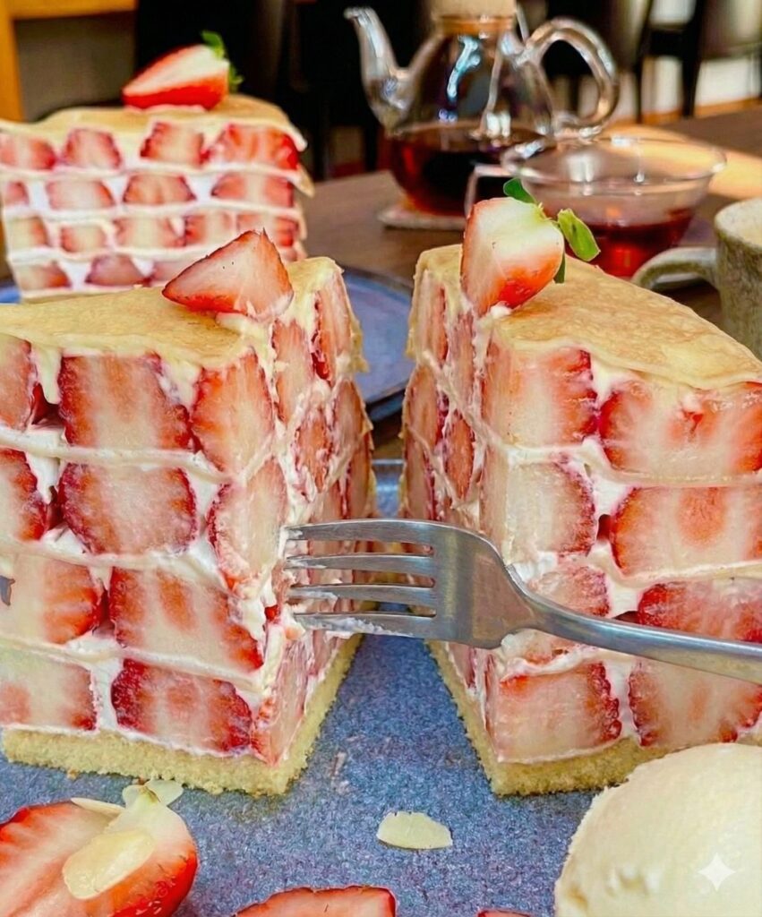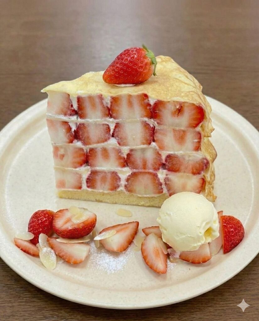今回Xで特に注目を集めているのが、六華亭の「苺のミルクレープSET」です。大量の苺の間に、生クリームとカスタードクリームを重ねたミルクレープを埋め込んだような構成で、見た目はまさに”苺の山”そのもの。ドリンクとセットで1,600円前後という価格帯で提供されています。