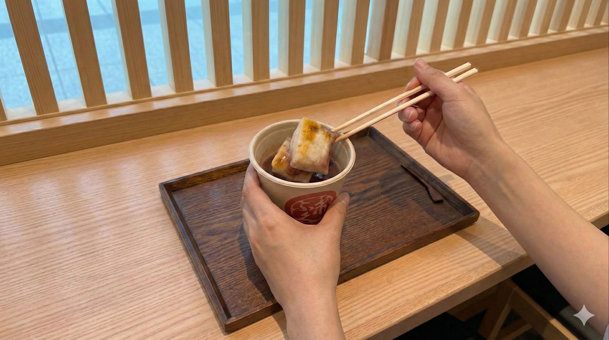 案内されたのは、目の前で仕上げの様子がよく見えるカウンター席。腰を下ろすとすぐ、静かにお餅を焼く音と、あずきが温められている甘い香りに包まれます。小ぶりのお餅がこんがりと焼き色を帯びていく様子は、梅田にいることを一瞬忘れてしまうほど“伊勢の風景”を連想させてくれました。
