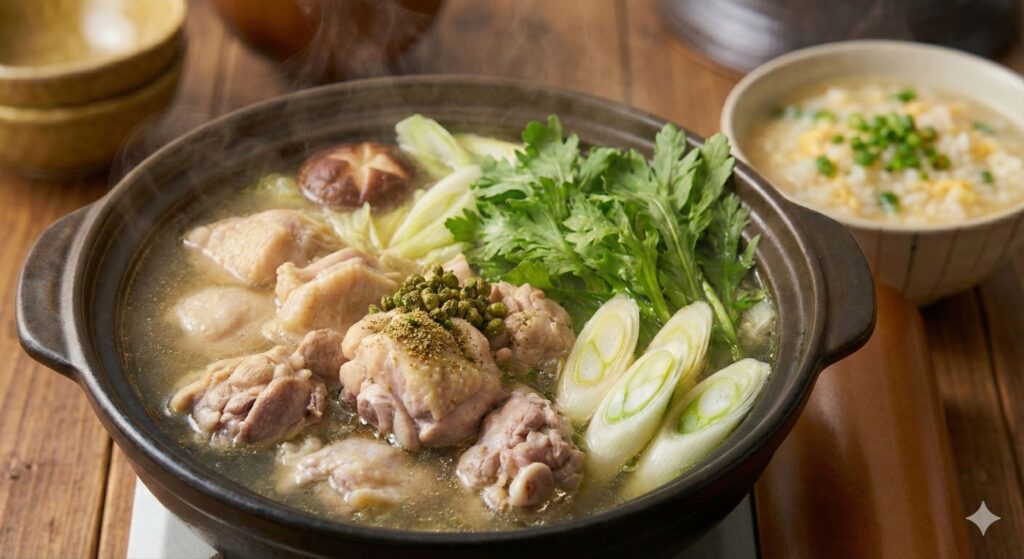鶏肉も骨からホロホロと崩れるくらい柔らかく煮えて、スープの旨味を存分に吸収しています。春菊の苦味もいいアクセントになって、大人の味わいって感じ。