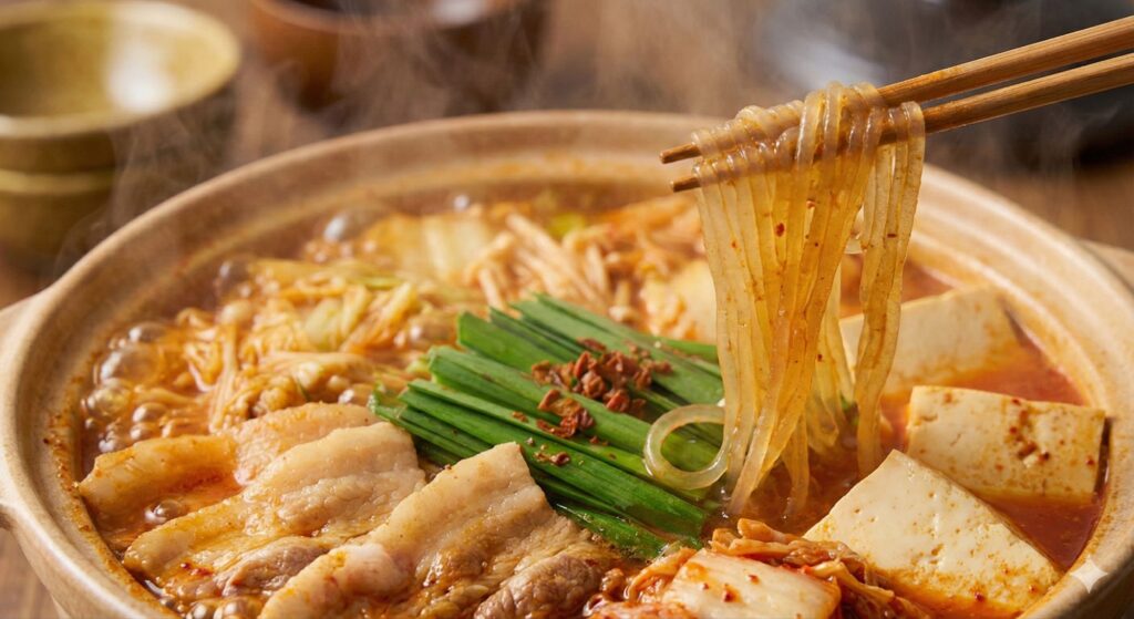 土鍋にスープを注いだ瞬間から、もう香りがヤバい!キムチの酸味と旨味が混ざった、食欲をそそる香りが台所中に広がります。これ、料理してる段階でもう美味しいって分かっちゃう系のやつです。