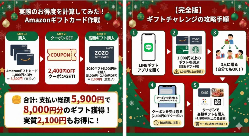 LINEギフト、ギフトチャレンジ、最大50%OFF、2,400円クーポン、Amazonギフトカード、ZOZOポイントギフト、クリスマスキャンペーン、ポイ活、節約術、お得情報、LINE Pay、eギフト、牛角、スシロー、すかいらーく、2025年12月、期間限定、裏ワザ、実質無料