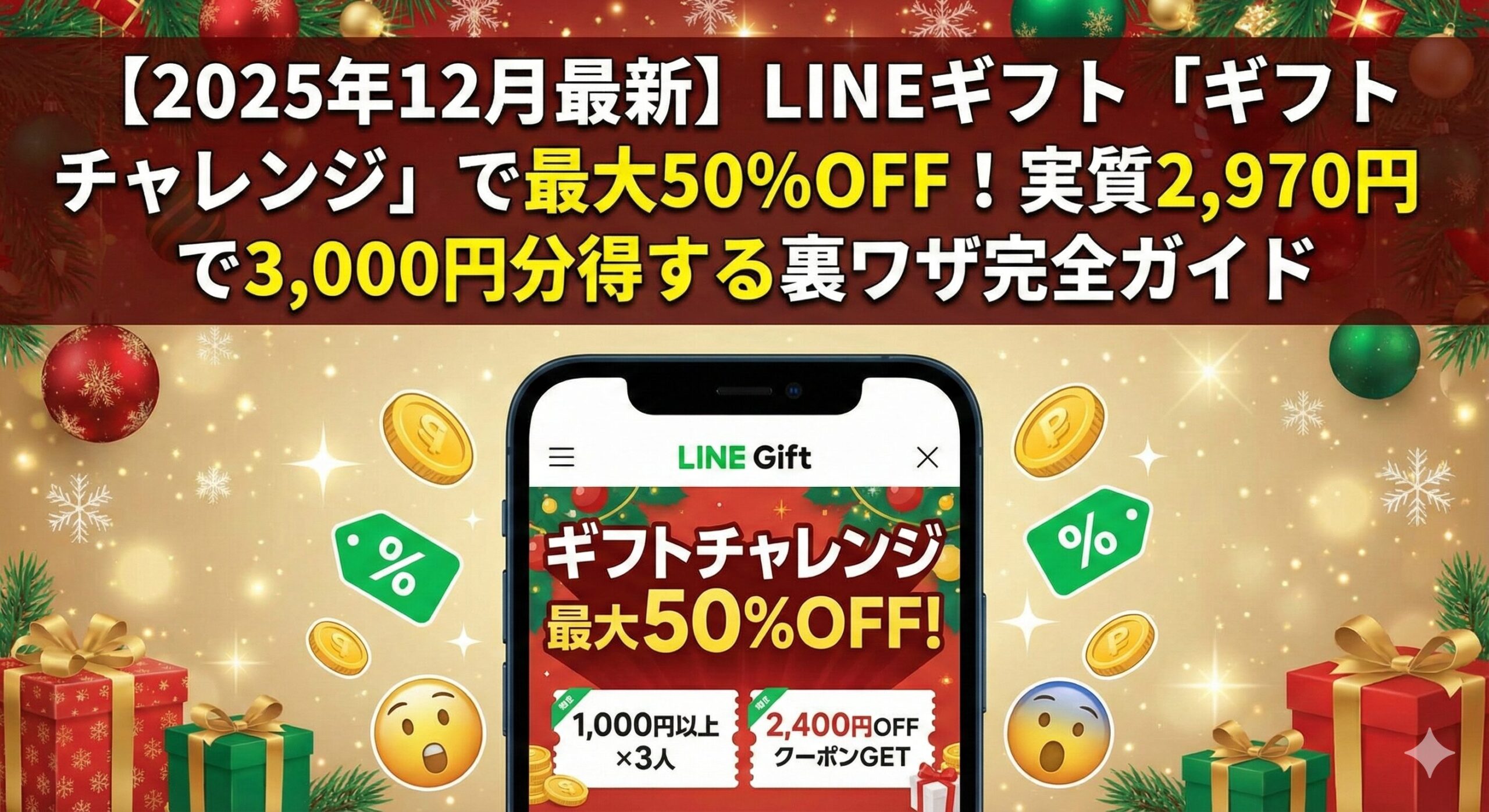 LINEギフト、ギフトチャレンジ、最大50%OFF、2,400円クーポン、Amazonギフトカード、ZOZOポイントギフト、クリスマスキャンペーン、ポイ活、節約術、お得情報、LINE Pay、eギフト、牛角、スシロー、すかいらーく、2025年12月、期間限定、裏ワザ、実質無料