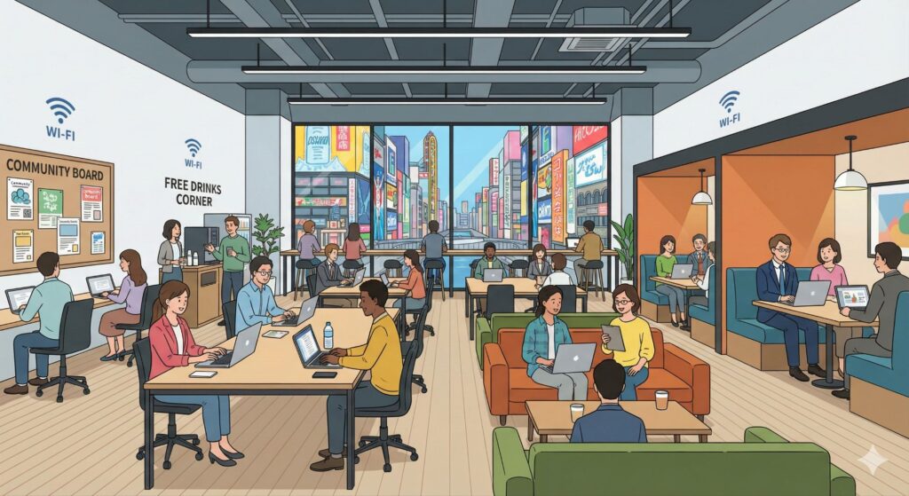 大阪市北区芝田にあるコワーキングスペース。快適な作業環境と充実した設備で、フリーランスやリモートワーカーに人気です。カフェスペースも併設されています。