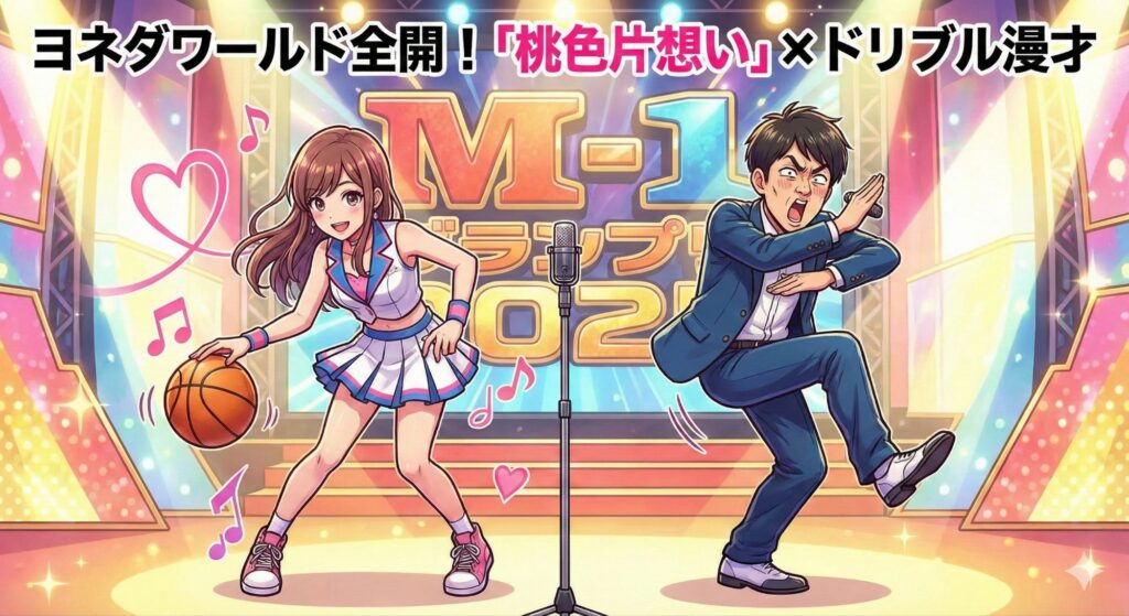 決勝では6番目の出場となったヨネダ2000。彼女たちはバスケットボールのドリブルをしながら、松浦亜弥の名曲「桃色片想い」に乗せて独特の世界観を展開する漫才を披露しました。いわゆる「ヨネダワールド全開」のネタで会場を沸かせましたが、審査結果は厳しいものでした。