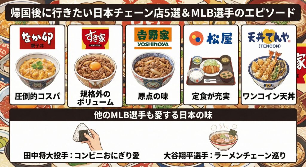 - なか卯、すき家、吉野家、松屋、てんやがMLB選手や海外在住者に特に人気