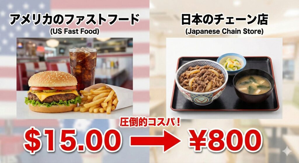 アメリカでの外食費は、日本の2〜3倍が相場です。ファストフードでも10〜15ドル、レストランでは30〜50ドルが当たり前。それに対し、日本のチェーン店は500〜1,000円でお腹いっぱいになれます。
