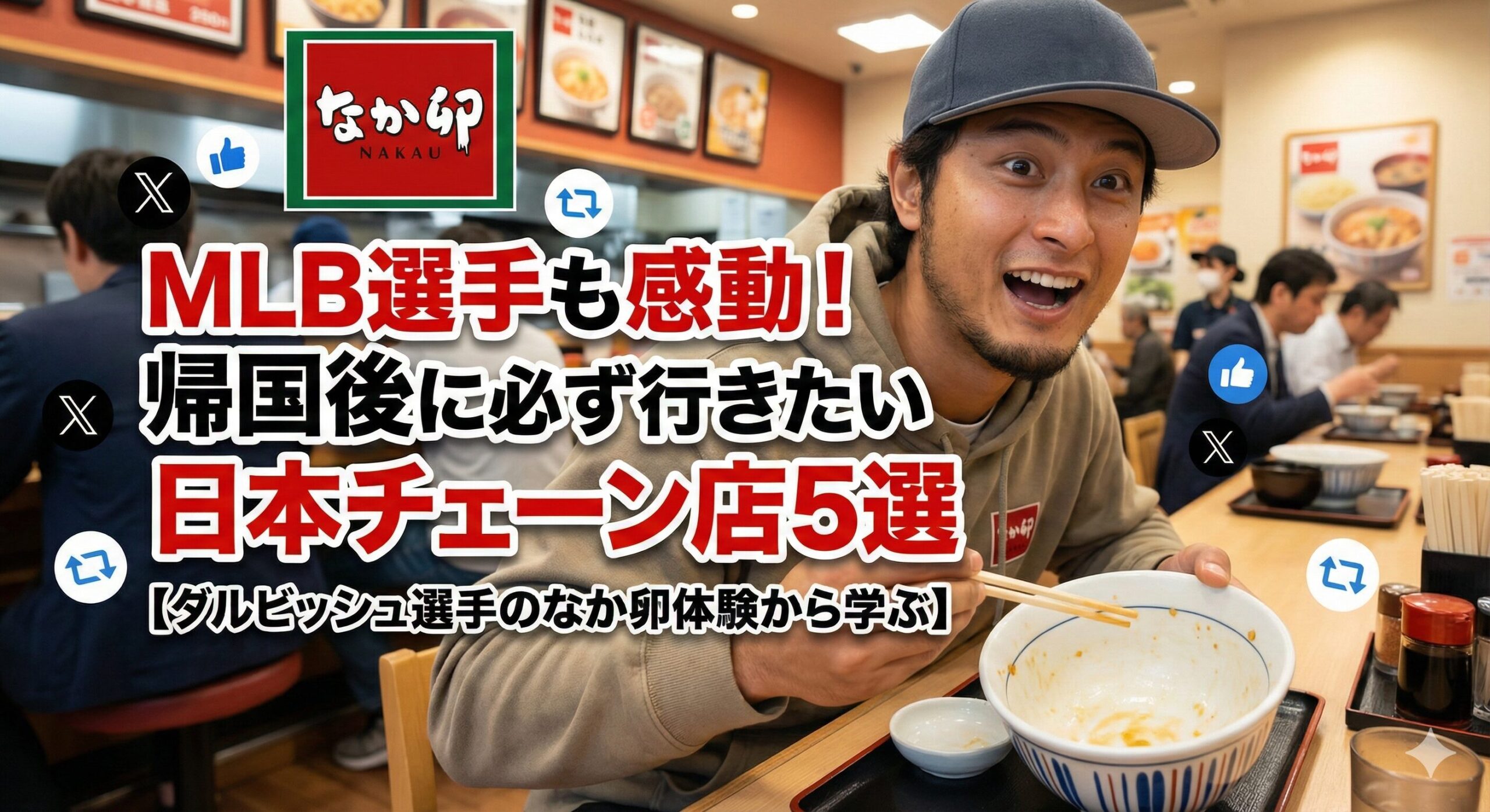 この投稿は、海外で活躍する日本人アスリートたちが、帰国時にどれほど日本のチェーン店を心待ちにしているかを如実に物語っています。本記事では、ダルビッシュ選手の体験を起点に、MLB選手や海外在住日本人が帰国時に必ず訪れたい日本チェーン店5選を、SNSの声や過去事例とともに詳しく紹介します。
