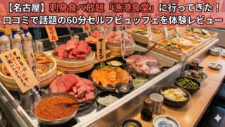グルメ 【名古屋】刺身食べ放題「漁港食堂」に行ってきた!口コミで話題の60分セルフビュッフェを体験レビュー 名古屋駅西と天白区・原にオープンした刺身食べ放題の「漁港食堂」が、X(旧Twitter)で「刺身好きの天国」と話題になっています。実際に名古屋駅前店に行ってきたので、システムや料金、刺身の内容、Xの口コミも交えながら、刺身食べ放題の実態をレ... 2025.11.29 グルメ