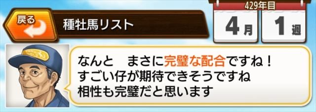 対象の種牡馬と繁殖牝馬の子系統の組み合わせで、相性が完璧となる組み合わせを選ぶ必要があります。