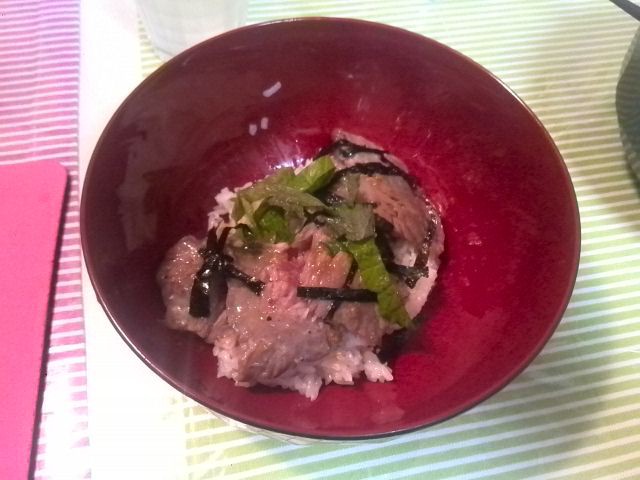 あとはできたらご飯を敷いたどんぶりに、ほほ肉、のり、青しそ(重要)を入れて完成。
