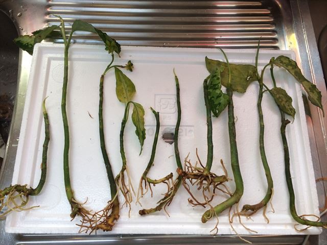 結果的に茎の方が生存する場合の方が圧倒的に多いと思います。根の方は状態が良いもの以外は割り切って捨ててしまいます。さらに養生用に思い切って痛んでいる葉っぱを落とします。この方法で養生する時は葉っぱはほとんど落とすようにしてます。気のせいかその方が根が出るのが早い気がするので(気のせいか・・・)