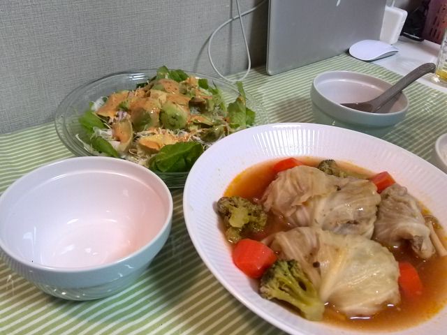 ジャンボロールキャベツ 20150809 おうちご飯 X Facebook はてブ LINE Pinterest コピー 2015.08.092016.02.10 キャベツの葉を丸々一枚使うジャンボロールキャベツです。 もはやキャベツではなく、白菜で巻いたようなでかさです。 コンソメスープベースに、ニンジンとブロッコリーを添えれば色合いも良くなります。 美味しいです。