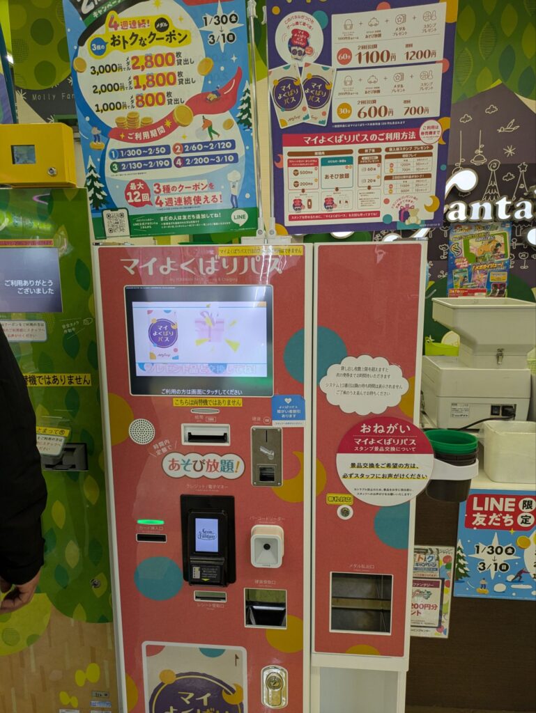 時間内定額でメダルゲーム・リズムゲームが遊び放題。ピンクの自動販売機やカウンターでカード購入、タッチしてスタート。クールダウン(太鼓4分など)ありだが、複数機種でローテOK。