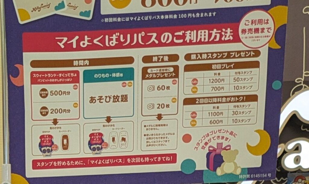 1000円で購入できるパスを使ってゲームをプレイするとスタンプ(ポイント)が30ポイント貯まる仕組み。500円コース、1000円コースなど複数のプレイオプションがあり、景品交換はポイントに応じて可能。おすすめ景品1000ポイントで交換できる大きなマイメロディのクッションやおもちゃが目玉。ポスターに描かれた可愛いぬいぐるみ風グッズが魅力だ。遊び方とコツパスを買って30回程度遊べば目標達成。定額制で効率的にポイントを貯め、マイメロファンにぴったり!