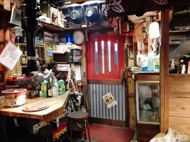 4人がけのテーブル席が4席あります。庶民的な居酒屋の雰囲気です。テーブルにドカっと七輪を置いて焼くスタイルです。