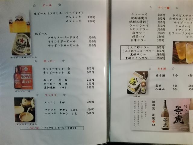 ビールは生が490円、瓶ビールが500円です。チューハイ系は300円前後なので安いですね。