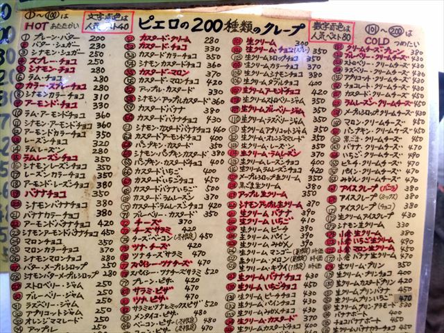 赤字が人気のようです。価格も200円~520円とリーズナブルです。3坪の店舗で200種類のクレープを作っているという事は、1坪あたり70種類近くのクレープを製造できる計算になります。圧巻です。