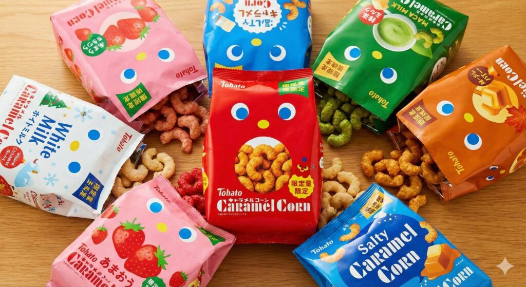 現在販売中の商品には、定番の「キャラメルコーン」のほか、「ソルティキャラメルコーン」「ショコラキャラメルコーン」、そして期間限定の「あまおう苺味」や「ホワイトミルク味(クリスマス)」などがあります。過去には、チーズ味(2004年)、抹茶ミルク味(2005年)、メープル味(2006年)、黒糖味(2007年)など、実に多様なフレーバーが展開されてきました。