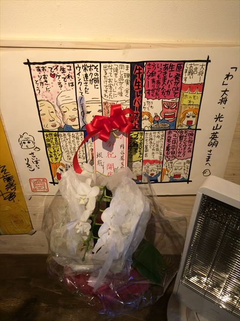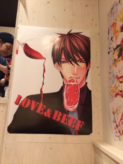 著名人のLOVE&BEEFのポスターがたくさん。肉山さんから持ってきたポスターでしょうか。福本伸行の名言があるのが良いですね。酔わないで人生がわかるか?おおおこれは漫画では見たことがない名言です。このポスターいいですねー。山本英夫先生の殺し屋イチの垣原ですね。これはいい。