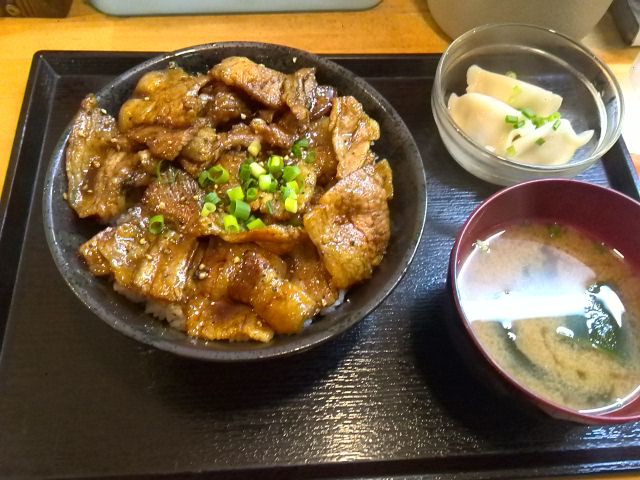 お店で食べると味噌汁が付いてきます。これは豚丼の中 800円です。ご飯の大盛りは無料のようです。
